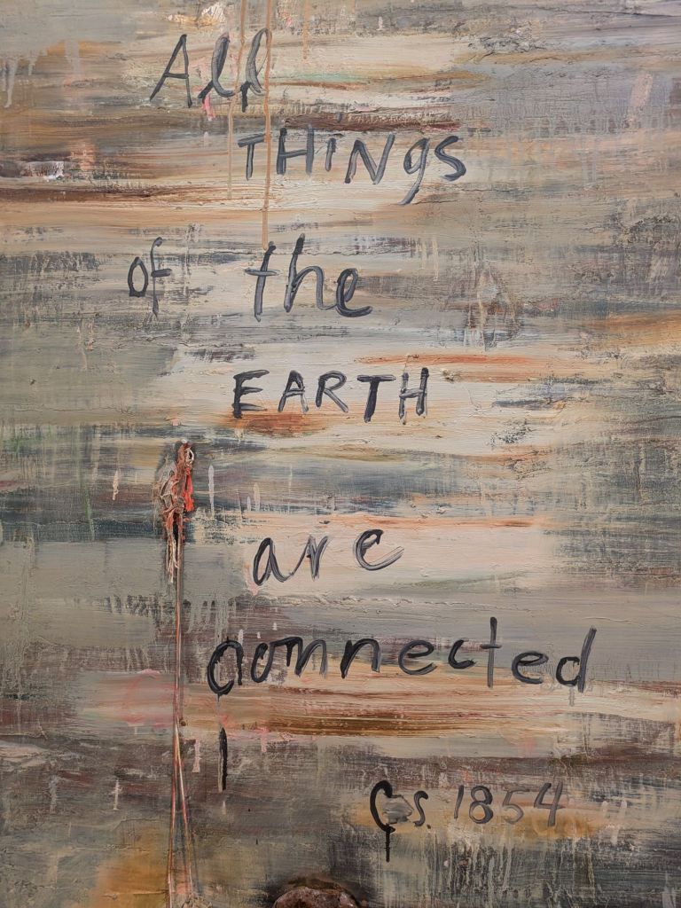 Returned for another visit having first seen the exhibition with Lara M Evans who generously shared her knowledge having worked with the artist extensively. In particular Lara drew attention to the references to Chief Seattle’s speech of 1856 – C.S. 1856 appears on some paintings.