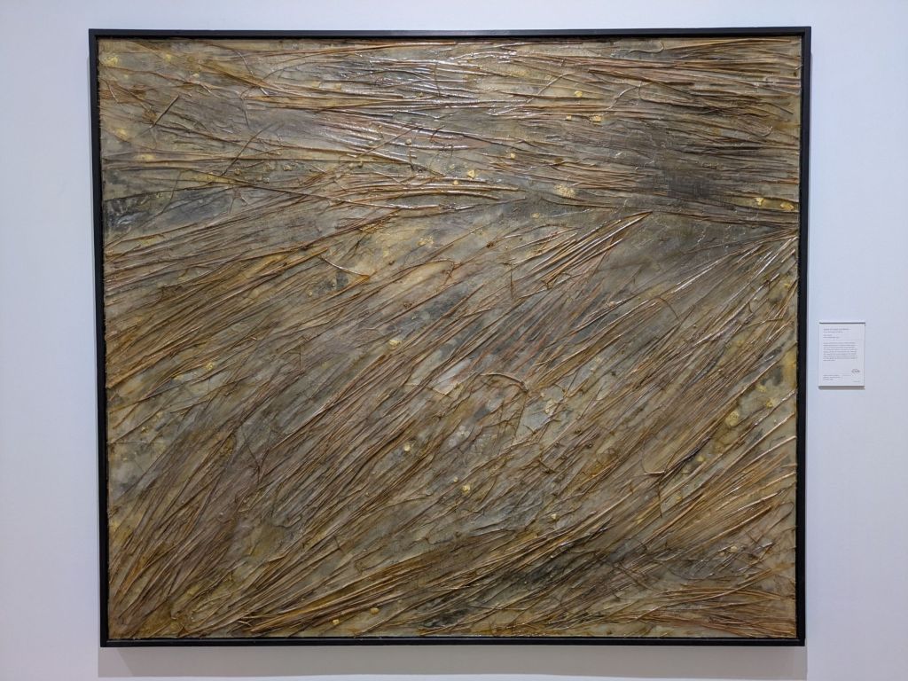 Rivetting exhibition of works including the familiar ‘drapes’ of flattened waste from bottled drinks, as well as works in wood and in print.