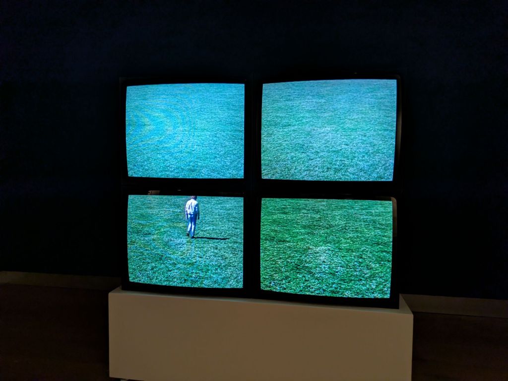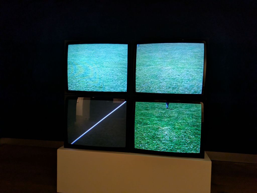 There is a film in the space too, entitled Nu Descendant Un Escalier, which seems to make use of Duchamp’s only piece of film, but remakes it with footage of mostly naked women descending stairs, and includes a title screen (below). Where all the other works are copies, this uses some different elements. It’s not the only invention hidden within the copies (see Beuys and Johns below). It’s also interesting that there are 2 bottle racks and between this and another room 7 Fresh Widows.