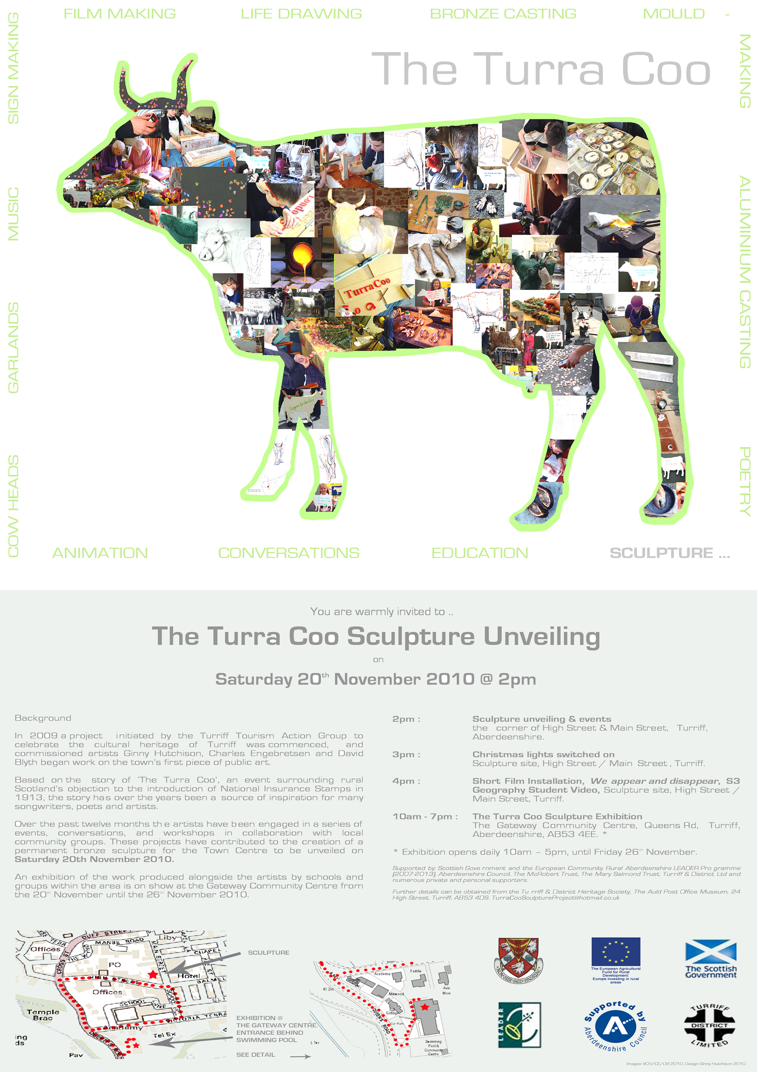 Those excellent artists Ginny Hutchison, David Blyth and Charles Engebretsen are finally unveiling their major new work, the Turra Coo. The original Turra Coo was the centre of a controversy about national insurance stamp. Slideshow on Radio Scotland.