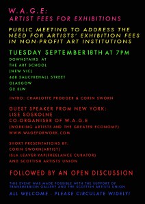 W.A.G.E. (Working Artists for the Greater Economy) are speaking at a public meeting at The Art School (New Vic) 468 Sauchiehall Street, Glasgow, at 7pm on 18 September on their ‘exhibition fees’ campaign.