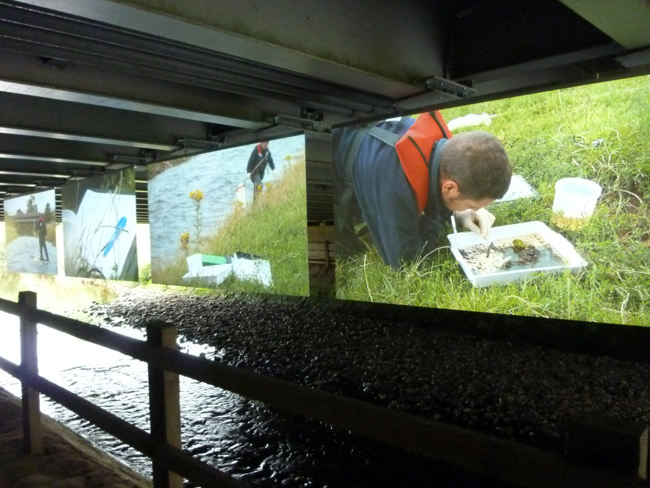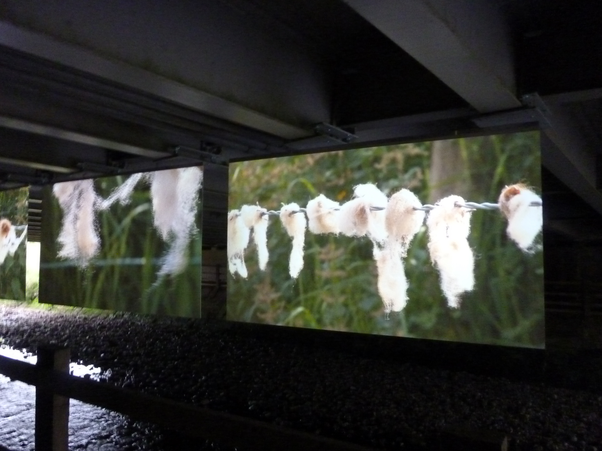 Cinema Sark at the Environmental Art Festival Scotland. It’s not often that video presented as sited work so elegantly uses it’s setting, or so engrosses the viewer. This work is a meditation on the many dimensions of the Sark, the river that divides Scotland and England in the West. The space under the M6 motorway is both a constant reminder of the context, but also an ideal location for the screening.