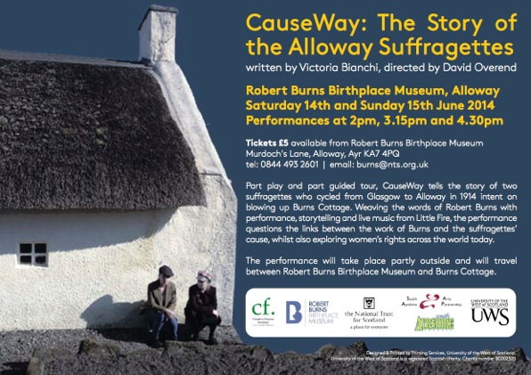 I don’t know how many of you are aware that Lord Kitchener’s niece was a Suffragette and that she and another Scottish Suffragette cycled down to Alloway and attempted to blow up Burns Cottage in 1914? David Overend and Victoria Bianchini have developed a new promenade performance work which you can experience in Alloway on Saturday 14th and Sunday 15th June 2014. You can get tickets from the Robert Burns Birthplace Museum.