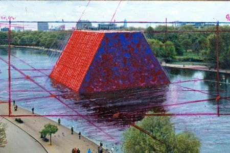 Curiously the Mastaba floating on the lake is more like the 2D works in the Gallery than you expect – it has an unreal quality, perhaps because of the formal geometry and the colour too. All the earlier proposals going back to the late 60s are yellow, red and orange, but this is maroon and purple. Maybe more complementary to the greenness of Hyde Park?