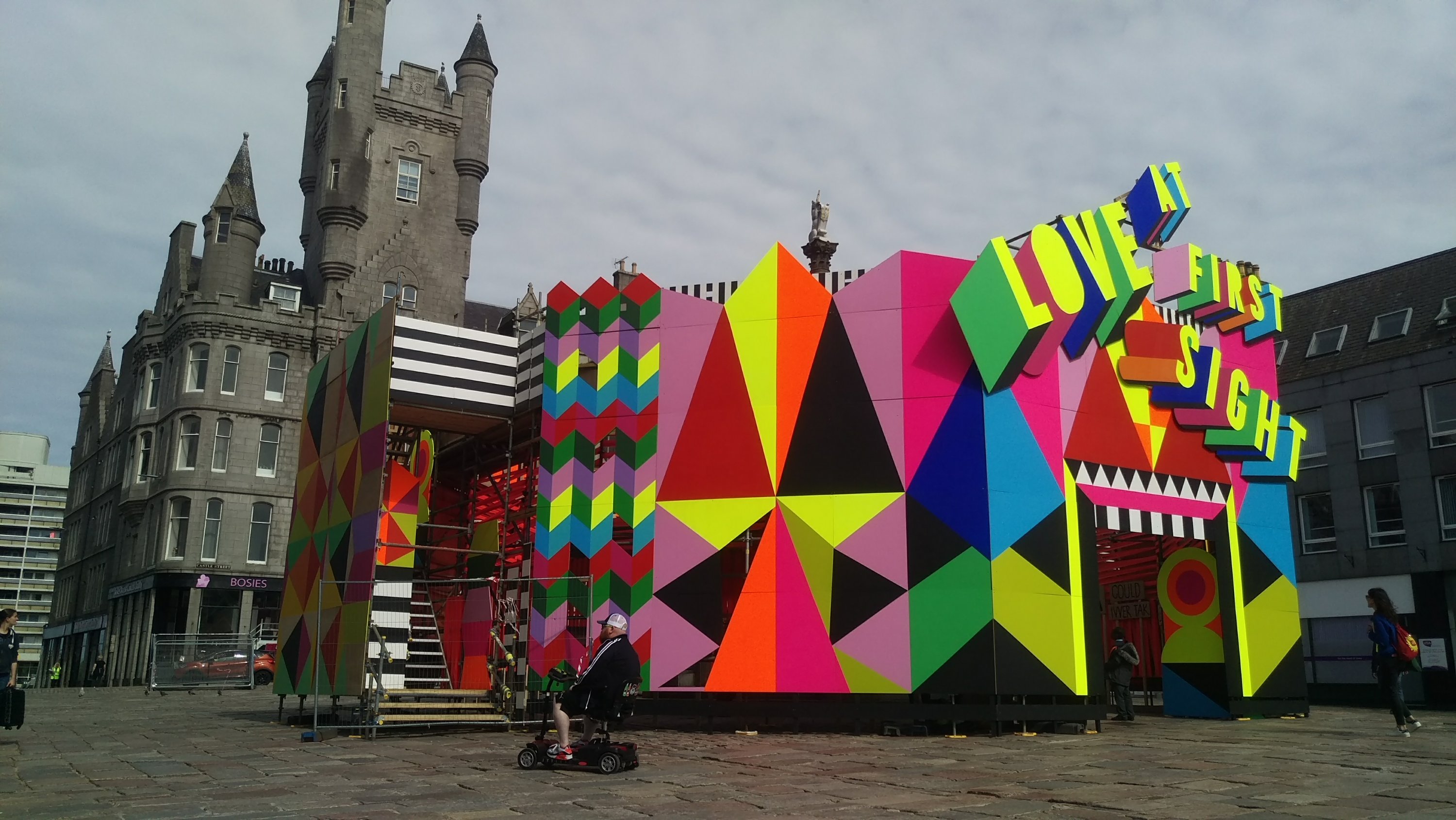 Morag Myerscough’s installation in collaboration with poet Jo Gilbert encompasses the Mercat Cross. Commissioned by Aberdeen’s LookAgain Festival (based in Gray’s)