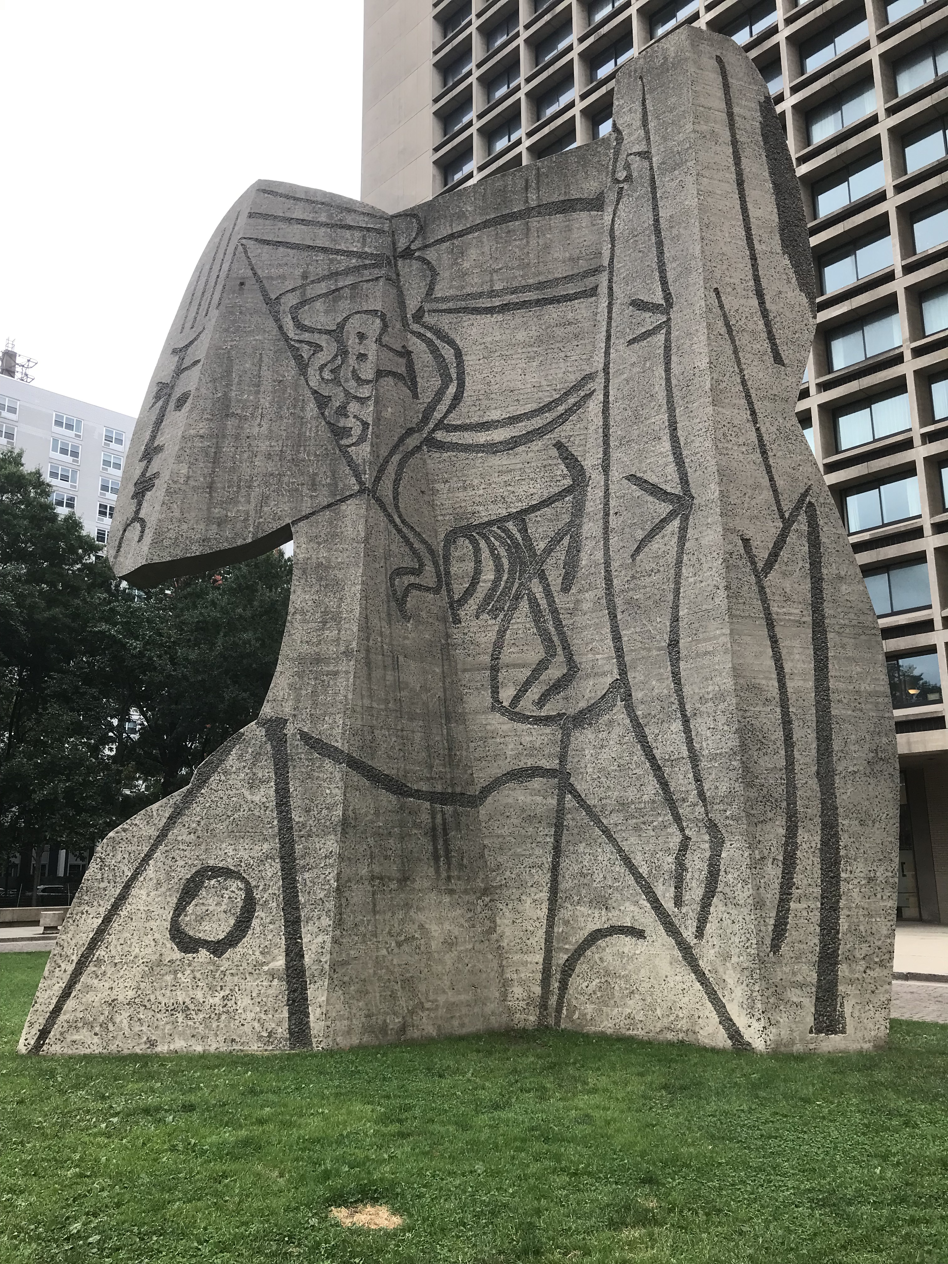 Downtown in Greenwich Village there is Alan Sonfist’s Time Landscape, a monument to the erased pre-colonial ecosystem of the island of Mannahatta, conceived in 1965 and realised in 1978. Now adjacent is an area of city gardens (or allotments), and a very large Picasso.