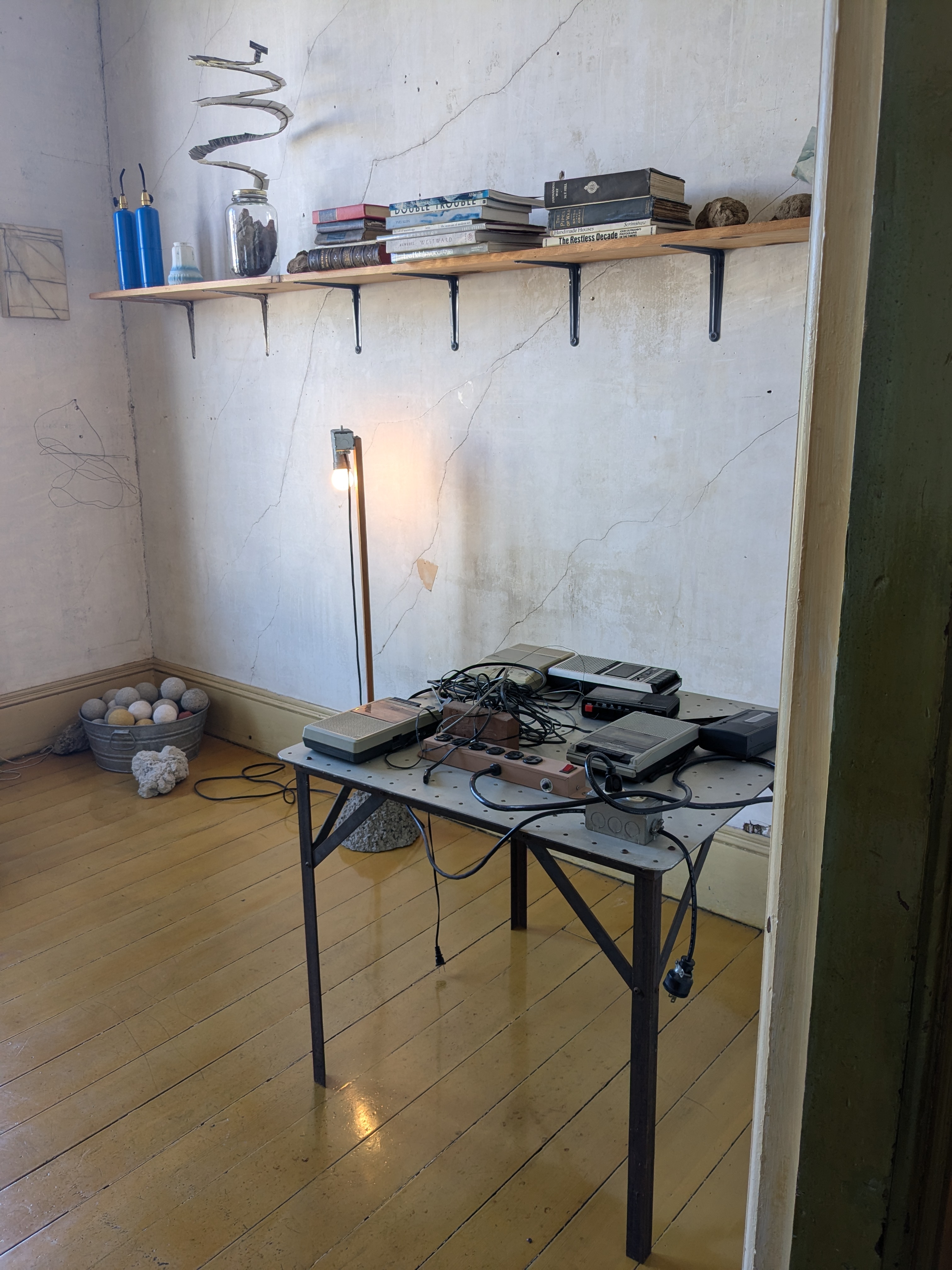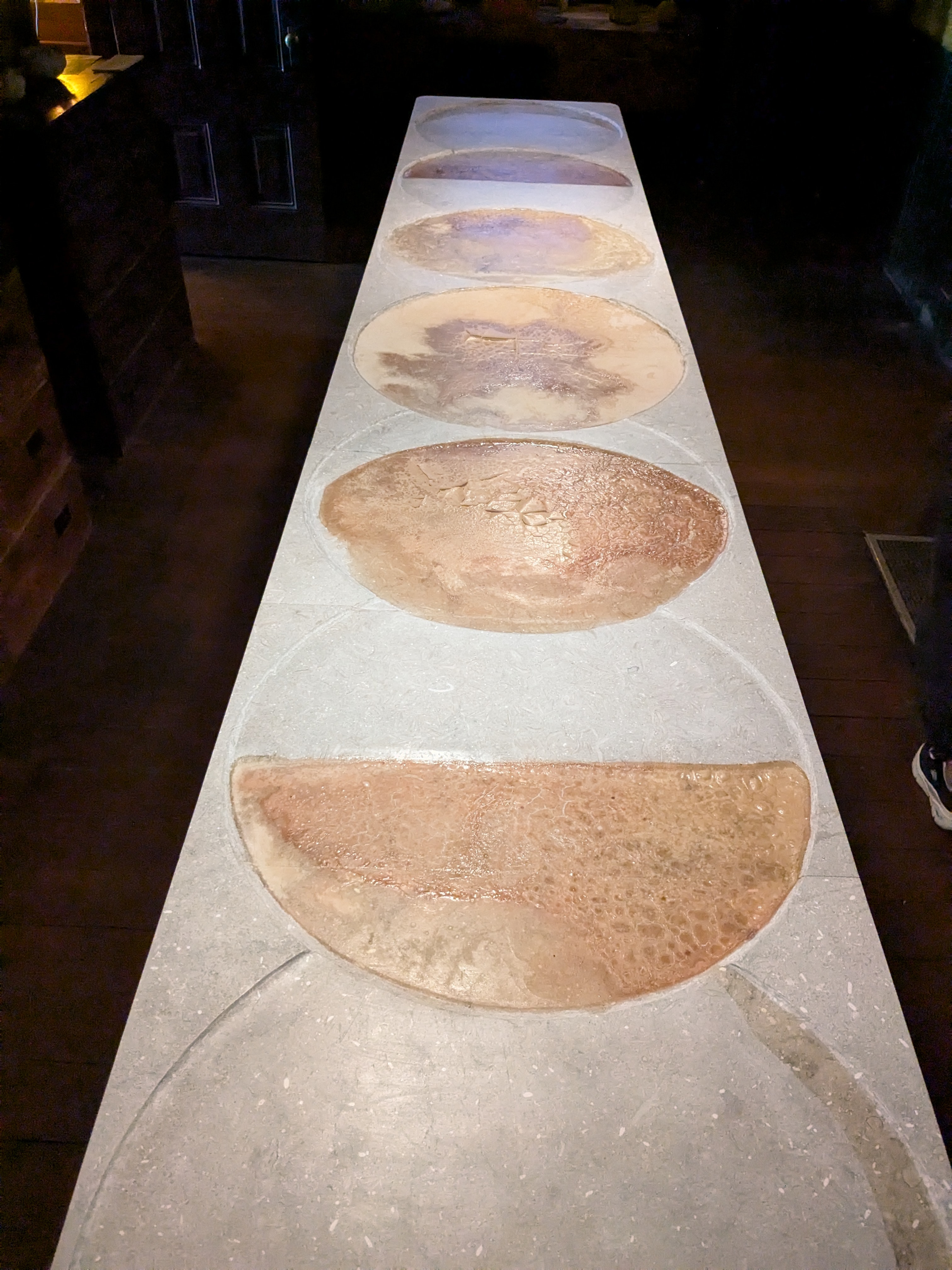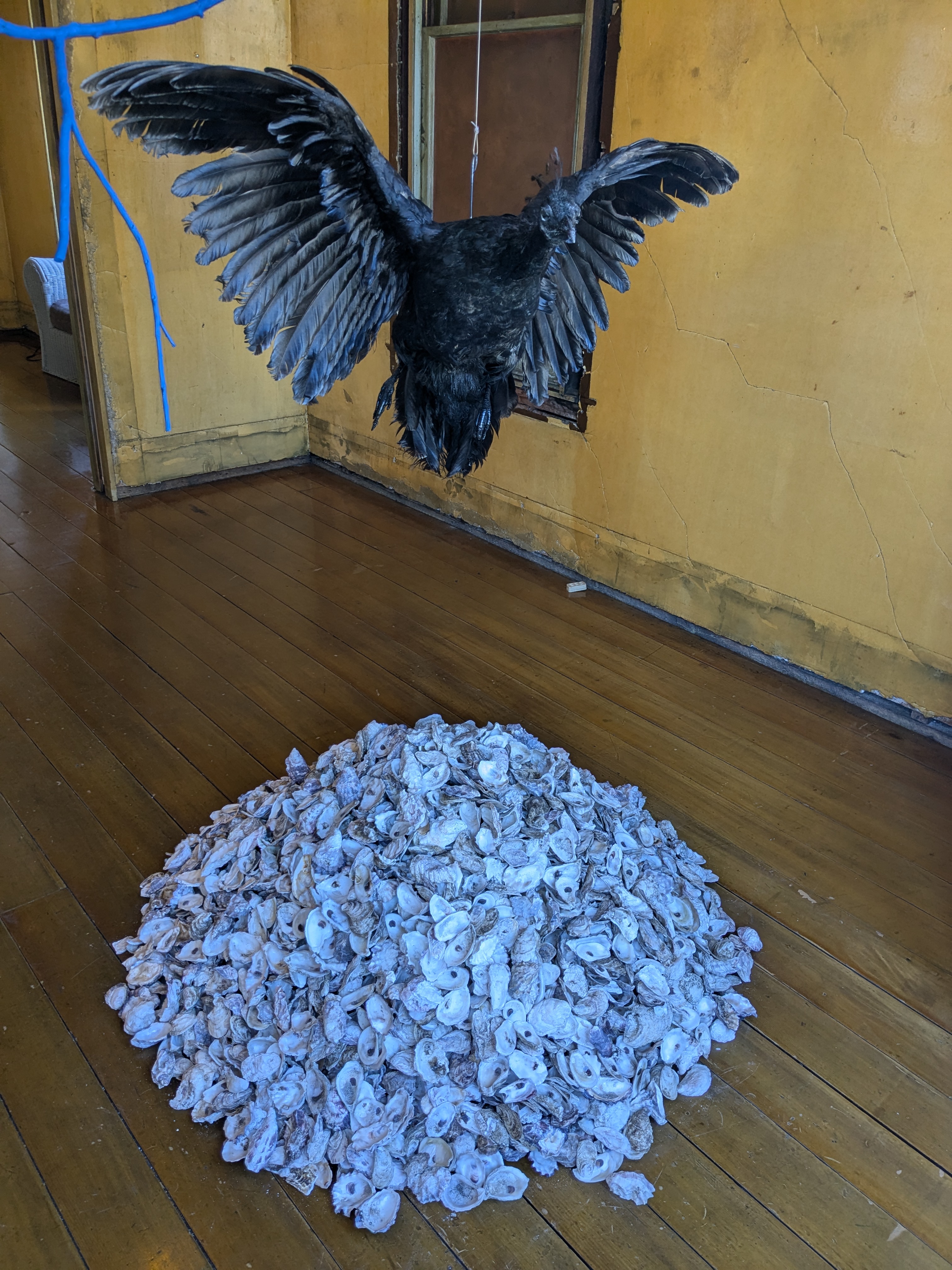 Photographs of the house and of installations by artists: Mildred Howard’s installation Collaborating with the Muses Part One (the large scale funnel installation in the back parlor, and the bird flying over the oyster shells), and Anne Albagli’s Milk Teeth (the carved limestone table in the dining room). There are no labels and the installed work sits in amongst Ireland’s interventions.