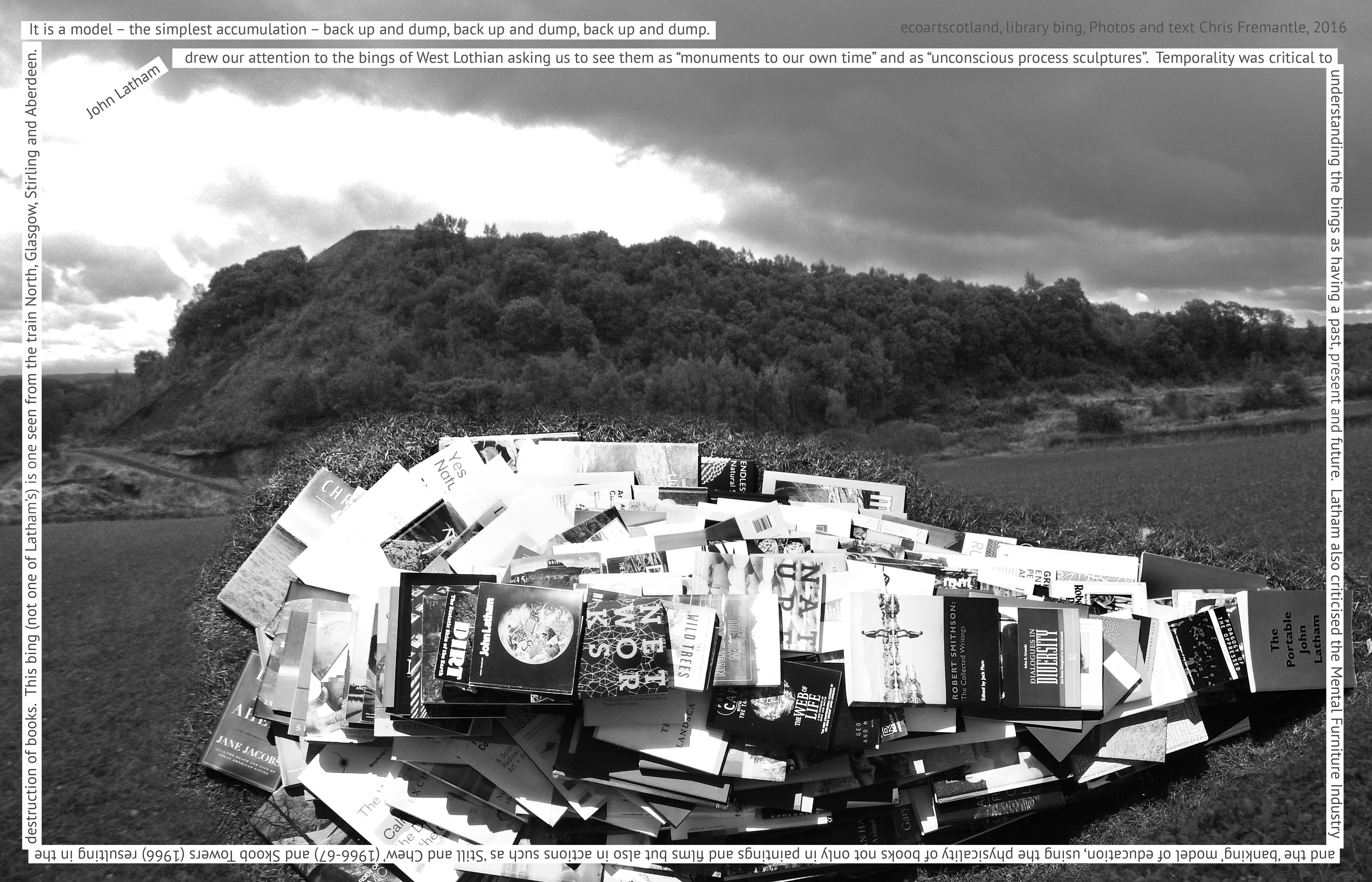 However, if it is also understood as a manifestation of the Mental Furniture Industry as proposed by John Latham, then it is necessary to test the relationship between the library and the bing. Is the library a form of waste from a process of accumulating cultural capital? Or, as with the bings, can it support the emergence of a diverse ecosystem?