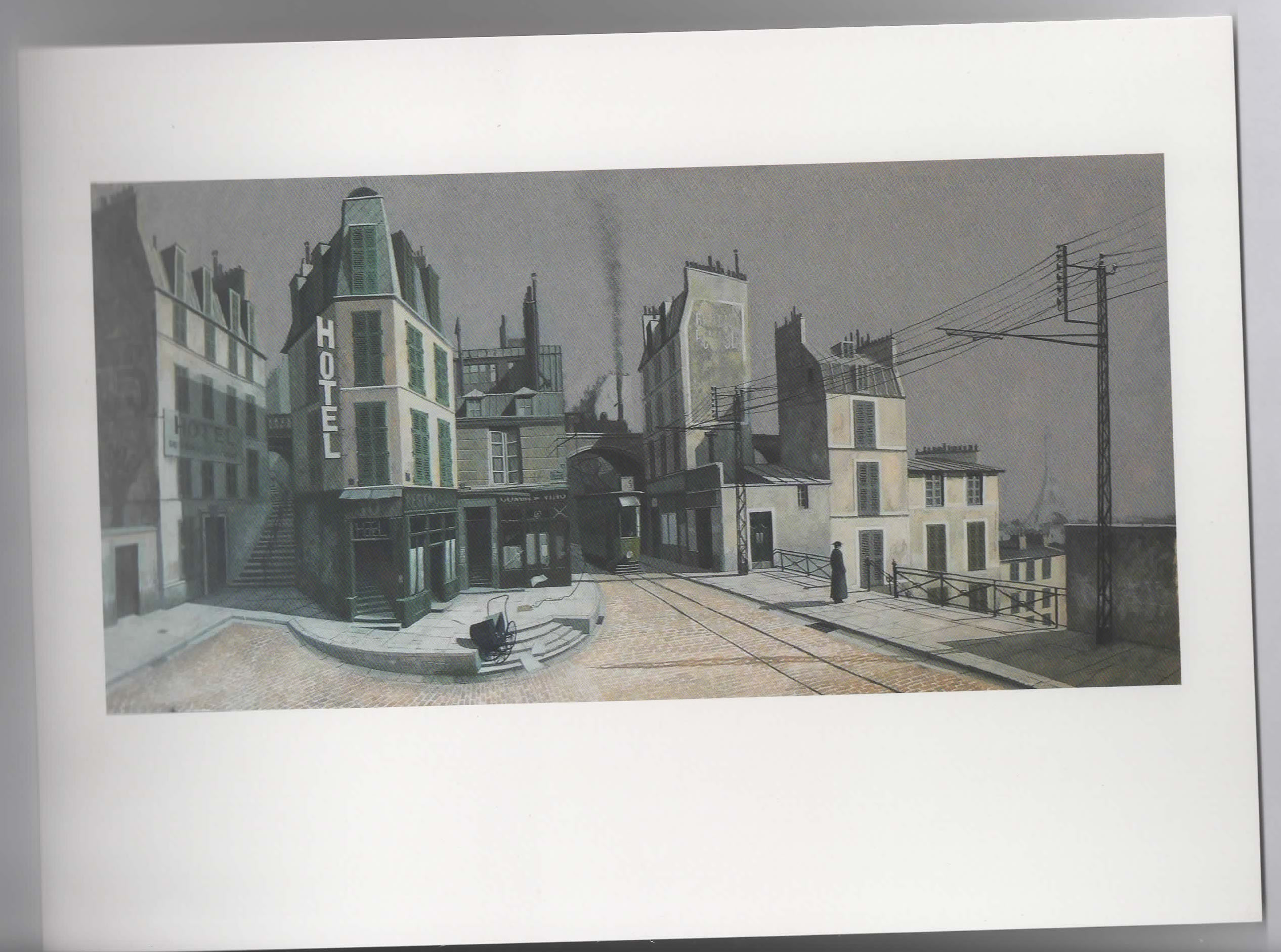 McNaught’s works, though labelled as watercolours, are not wishy washy or lightweight. The scenes remind me of various parts of Europe – the appearance of the Eiffel Tower in the distance suggests a working class suburb of Paris, but some of the architecture suggests Italy. The ships, trams and buildings suggest an unmodernised area. The relationship between key aspects of the foreground, the recurrent ‘Abbe’, the crows, the prams sometimes upset, and the papers caught in gusts all suggest a narrative of the imagination. The symbolism of the ‘abbe’ and the crow, in at least one image obvious transformed from one to the other, is perhaps in competition with the symbolism of the Eiffel Tower, the centennial monument to the French Revolution. I’d associate the papers, stacked on a pram or caught in gusts of wind in otherwise very still space, with another form of knowledge from the religious, perhaps with revolution, but communication is also broken – in a number of works the overhead telephone lines are broken. But my favourite was a work entitled ‘still life with all the objects fallen to the edge of the table’, or something like that – almost Juan Gris cubism.
