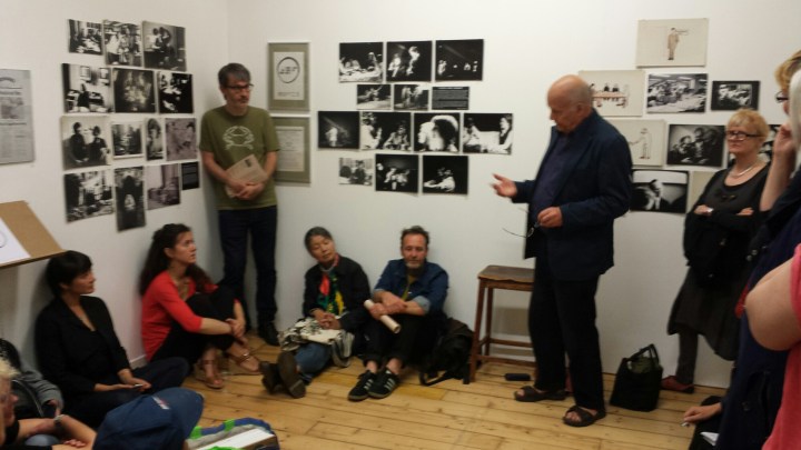 Gustav Metzger co-curated the programme of last years’ Serpentine Marathon titled Extinction: Visions of the Future on 18th and 19th Oct 2014. During this time his work, Mass Media: Today and Yesterday was livestreamed from Herbert Read Gallery into the Serpentine Gallery throughout the course of the Marathon. Fine Art students from University for the Creative Arts created a media wall from newspapers for 18 hours over two days. Students were fully immersed in this work, scouring newspapers, silently cutting out key texts relating to extinction, working in pairs for 2 hour blocks. This exhibition was curated by Andrea Gregson, Senior Lecturer in Fine Art, at UCA Farnham.