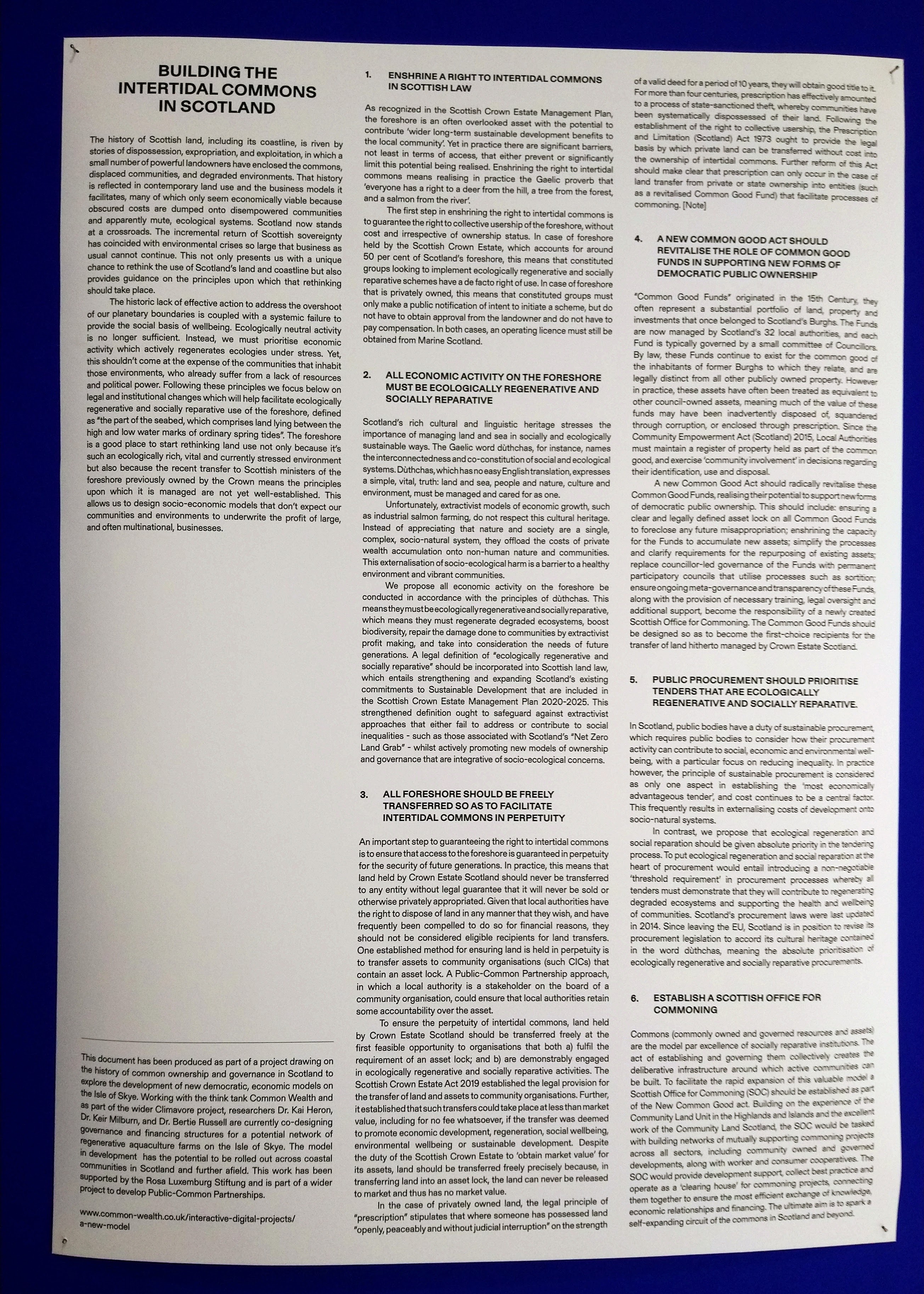 There is an important set of proposals around commoning which directly relate to Newton Harrison’s On the Deep Wealth of this Nation, Scotland. Where that work proposes understanding the soil, water, air and forests of Scotland as commons that we are dependent upon and asks for a ‘commons of mind’ to commit to putting back more than we take out, the proposals around commons in this exhibition include that the whole intertidal zone of Scotland should be established as a commons and that a Scottish Office for Commoning should be established. This proposal needs published as a full page pull out in the Highland Free Press or another widely distributed publication.
