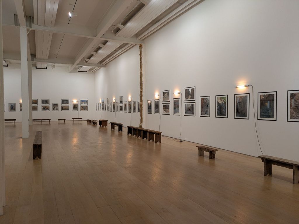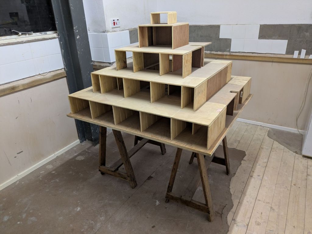 The structuring of the dignified neoclassical spaces into a series of workshops, lacks only the suspended fluorescent lights to fully realise the conceit. The partitions’ materials, structures and even adornments are all evocative of industrial spaces across the UK.