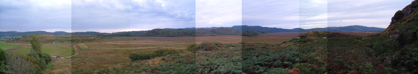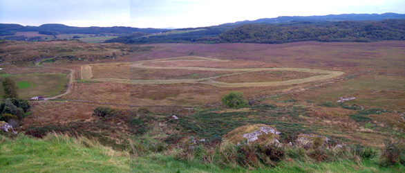 Of course Dunadd is the ancient seat of the Kings of Dalriadda, spanning the West coast of Scotland and also Northern Ireland. From Dunadd you can see Loch Craignish and the Sound of Jura, and below you in the foreground an incomprehensible symbol has been mown into the marshy valley floor. There are so many lines – roads curling over outcrops, dykes, straight fence lines more evident from the level line on the earth than the posts and wire. The profile of the surrounding hills is remarkable. The moments of green in the brown and purple.