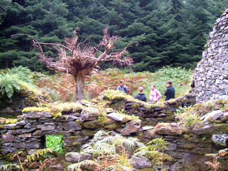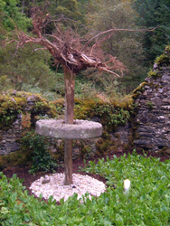 The final stop, where I saw Adrian, Susan and the others again was Mill Cottage. I was kind of afraid I was in for another sound installation. This one was different – in the middle of the one-room derelict roofless cottage was a dead tree inserted into the ground upside down. Halfway up had been set a new millstone. Around the bottom were white marble chips and covering the floor of the space was a vegetable garden of probably lettuce.